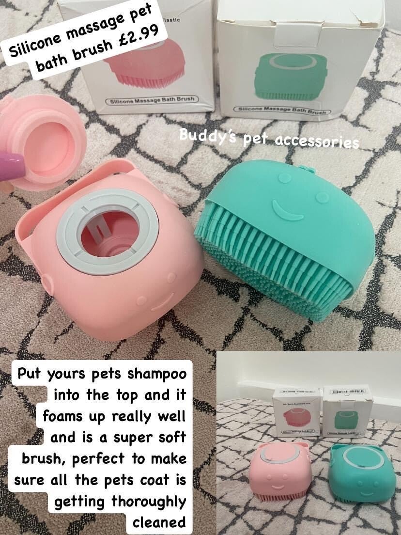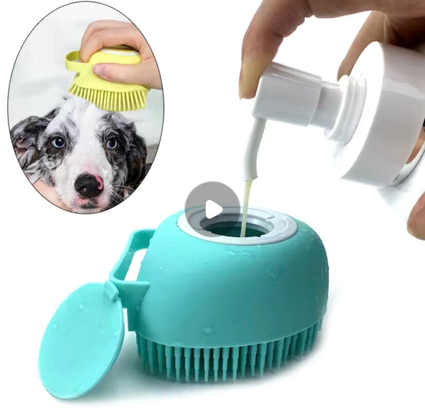 Silicone pet bath brush, put your pet's shampoo in to the top of the brush this will then foam up really well and come out of the brush as you brush your pet in the shower/bath. This will make sure all your pets coat is getting throughly cleaned, and will massage your pets skin and fur well