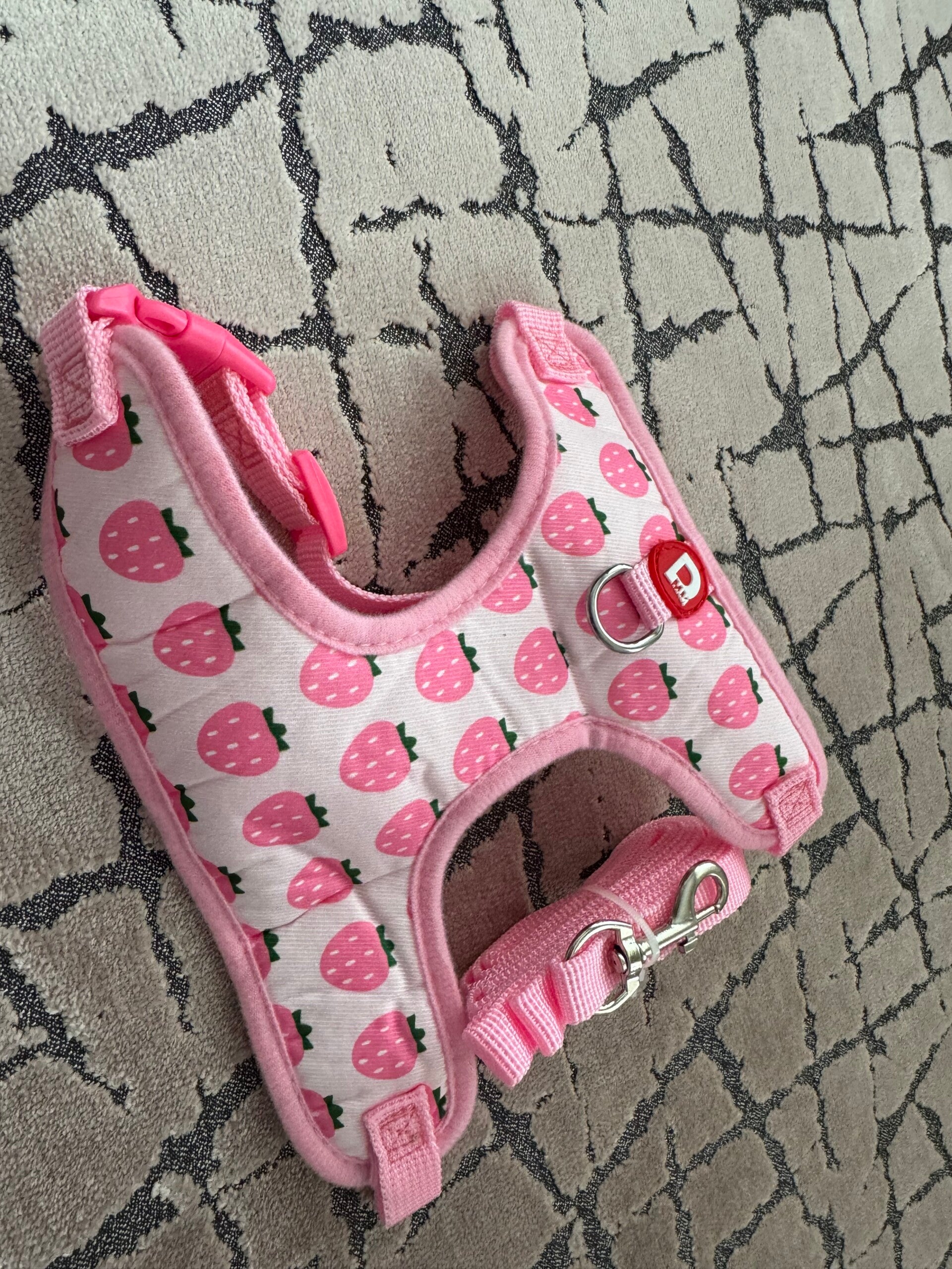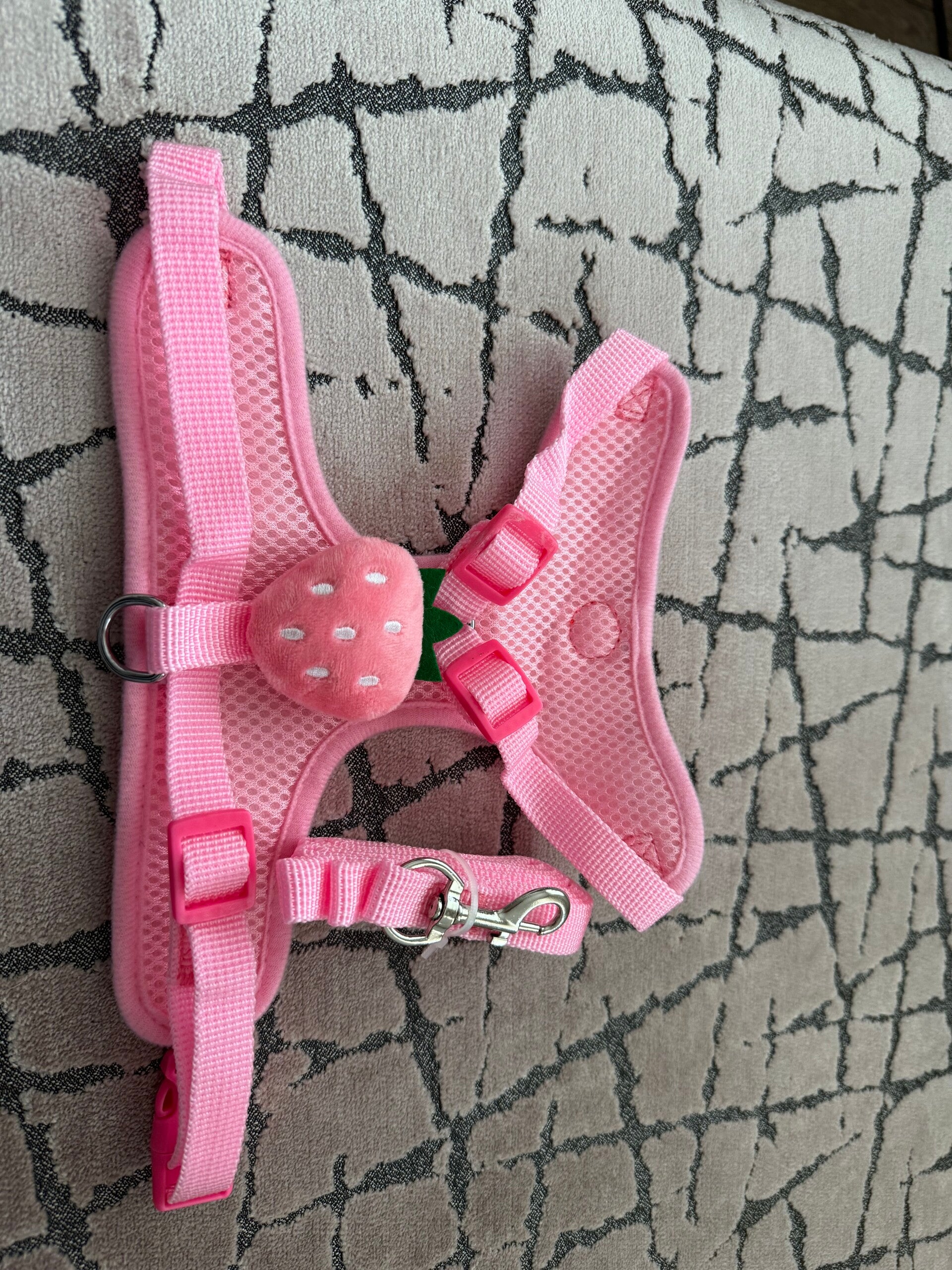 Harness & lead set, perfect for a small dog breed and is adjustable on the neck and chest. Please see the size chart for measurements, they can come up slightly smaller